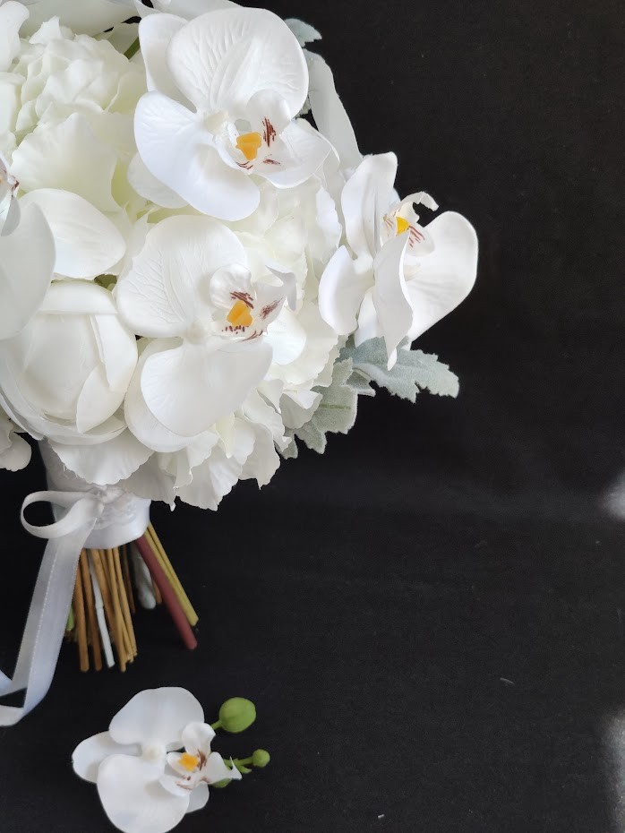 - Ortanca ve şakayık üzerine zarifçe yerleştirilen gerçek dokulu orkide çiçekleri, bir yanından hafifçe uzanan orkide tomurcukları ile şık ve asil bir gelin buketi…