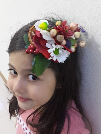 Kurutulmuş portakal, fındık taneleri ve yapay çiçeklerden tasarlanan neşeli saç aksesuarı.