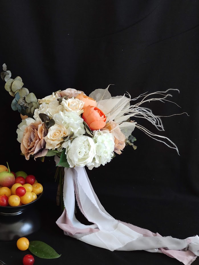 Gerçek dokulu yapay çiçekler, hayalet yapraklar, şoklanmış okaliptüs, sıcak tonlarla tasarlanan gelin çiçeği